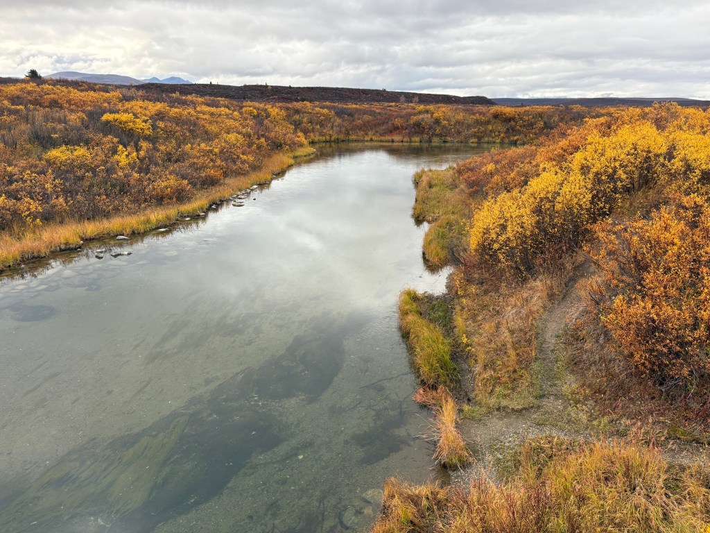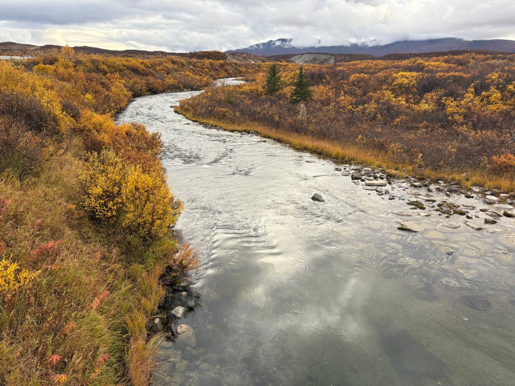 And finally, here are some of the things I saw on the last leg of my 234 mile journey south from Fairbanks. This stream was just off the highway. There was a metal overlook that I took the photos from and signage that indicated it is popular with fishermen. I didn’t see any fish or fishermen in the area.
