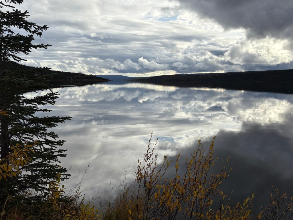 And further down the road I came to Paxson Lake. The clouds were lifting some but they still looked rather ominous. The lake surface was almost perfectly calm.