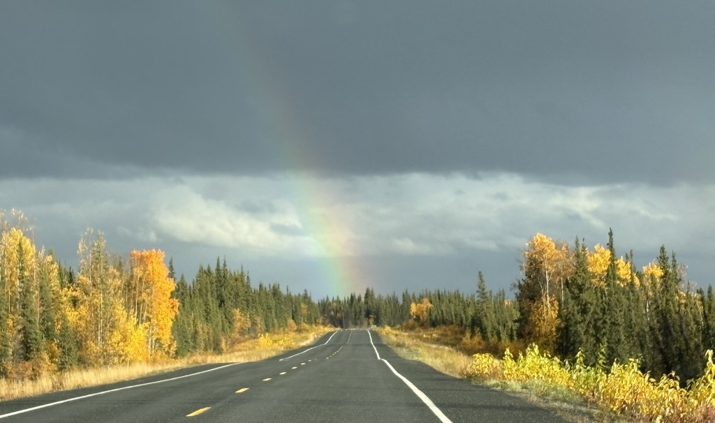 I could see some dark clouds in my direction of travel, though, and it looked like they were dumping a good bit of rain. Fortunately the road took me around it and I was soon treated to this rainbow ahead of me.