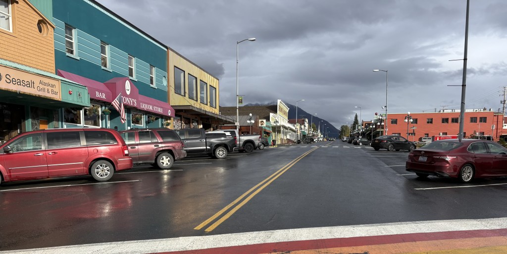 Here is a photo looking up “Main Street” (actually, 4th Avenue) from the Aquarium. It goes on for several blocks before reaching the area I was in yesterday. 3rd Avenue, one block to the left from this view, is Highway 9, locally known as the Seward Highway, which is Highway 1 from Anchorage as far south as Tern Lake, where Highway 9 turns off to come down here. The highway ends just south of the Aquarium.