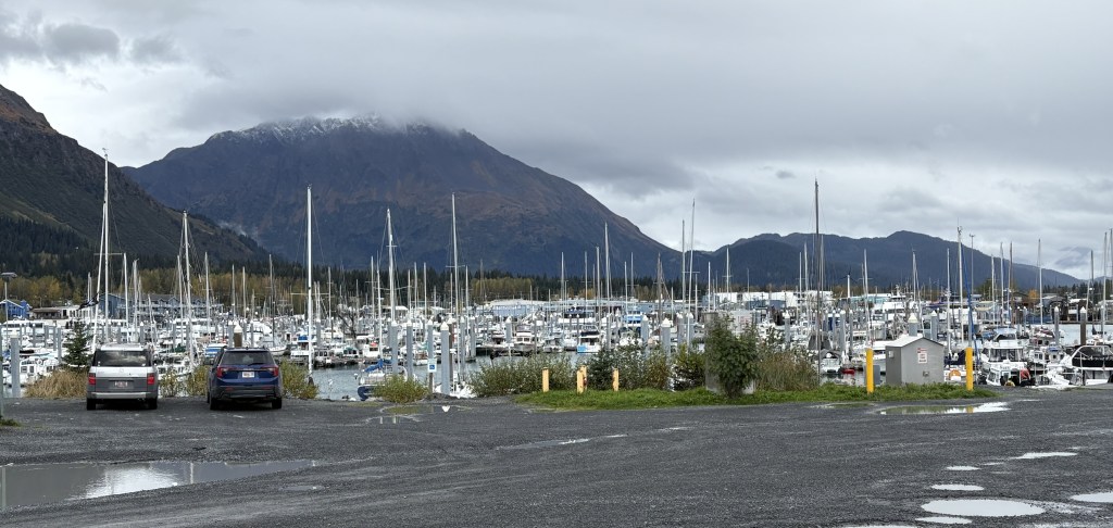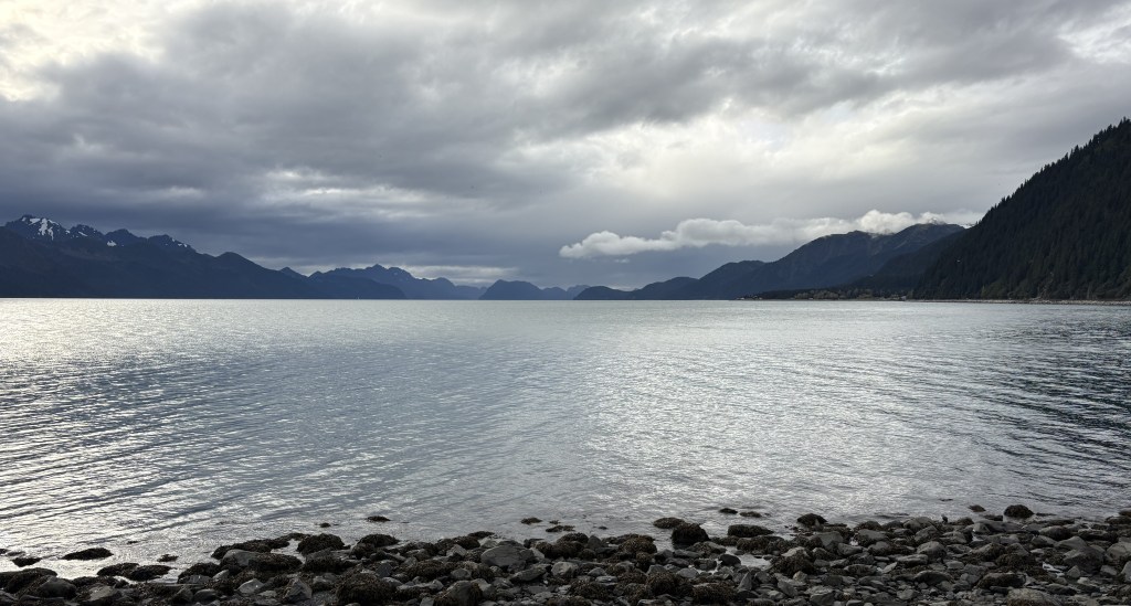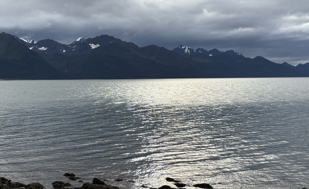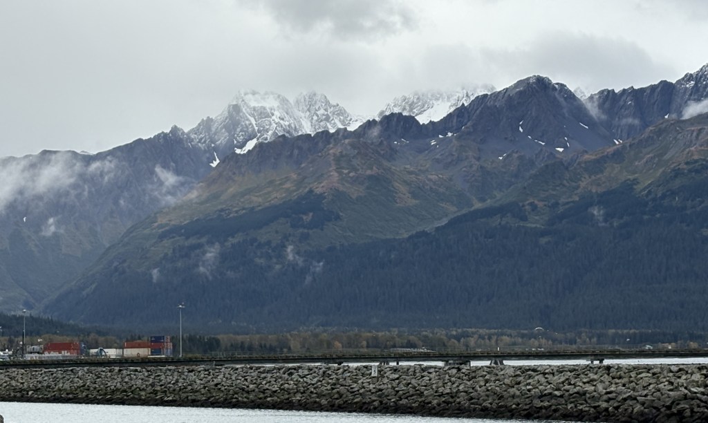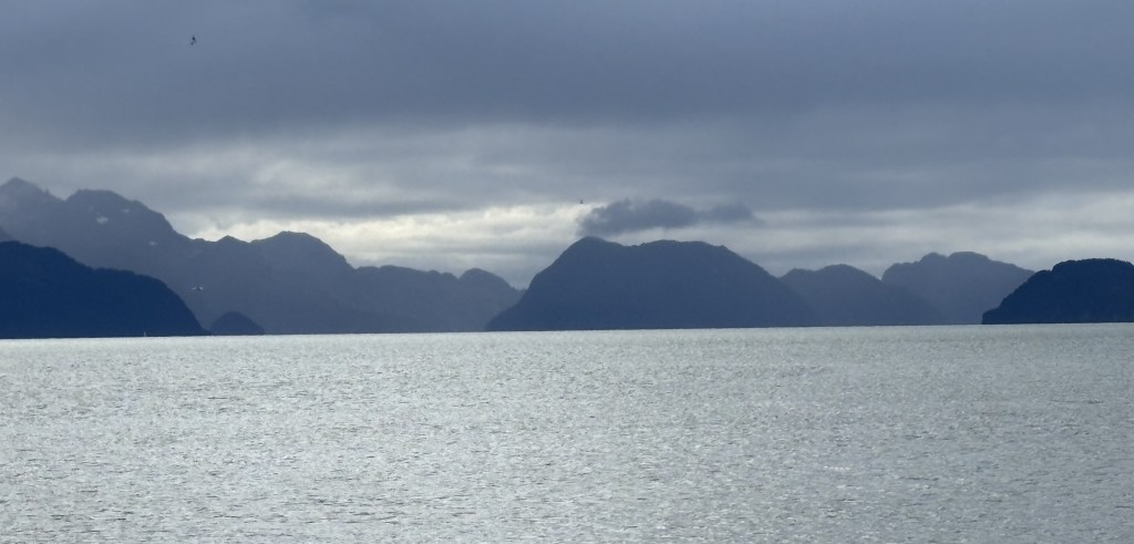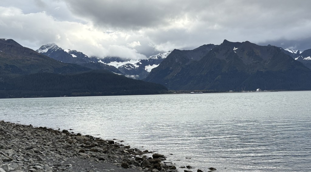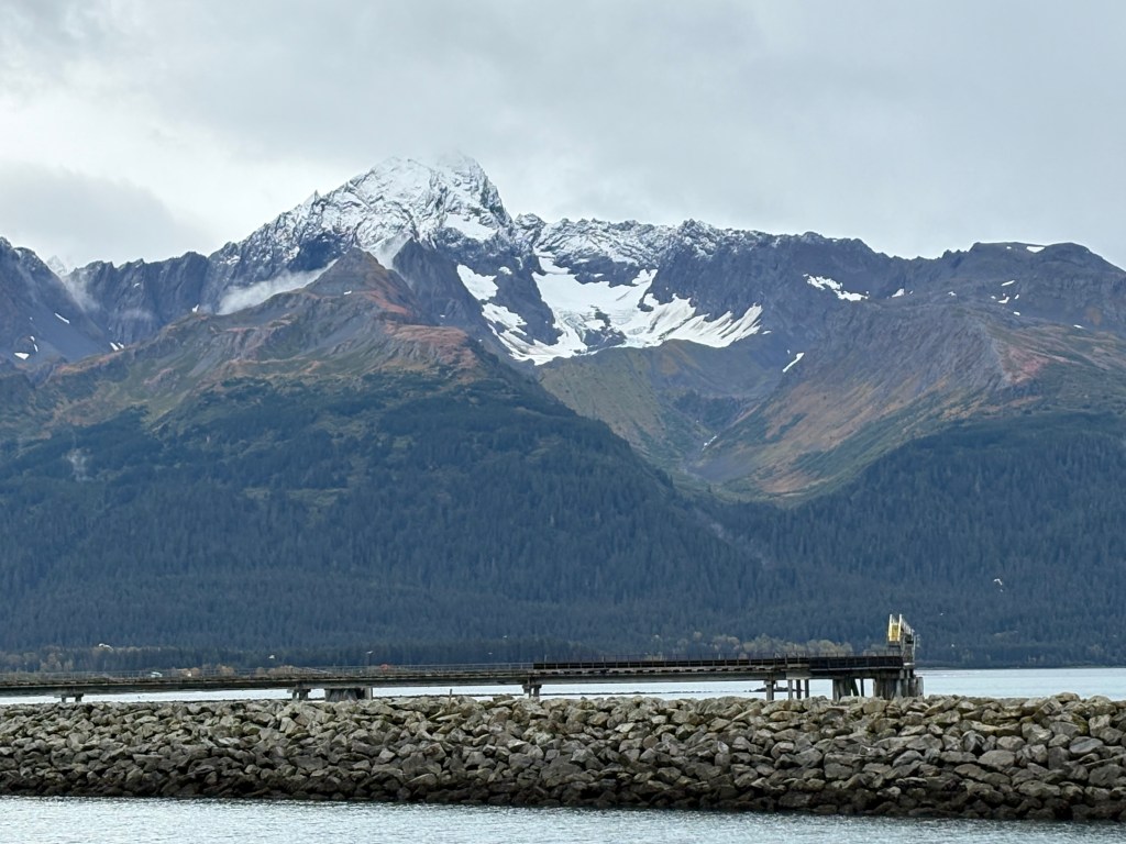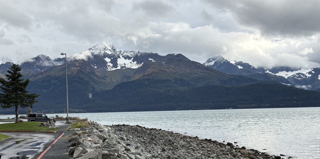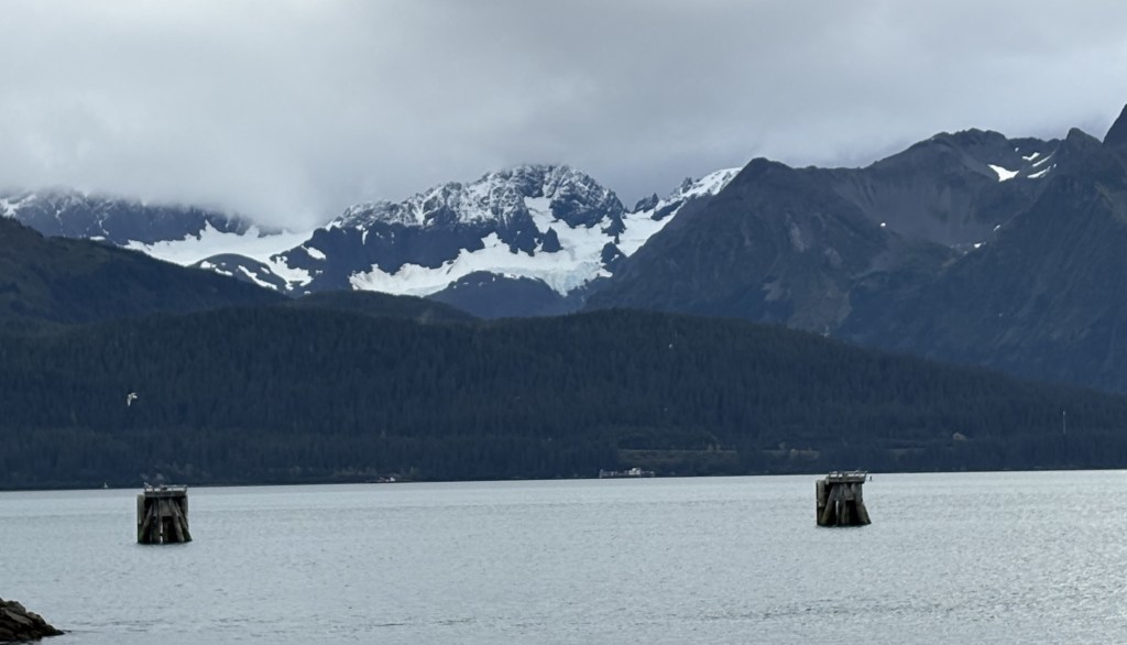 It looks like it is closed in by mountains. This is why I reposted the map showing my route down from Anchorage. As you can see at the bottom of the map above, there is a large opening out to the Pacific Ocean, but from town the view is looking southeast so some of the land masses you see are islands beyond the east side of the opening, and you can also see “mainland” mountains on either side of the Bay which close in a bit as they approach the opening.