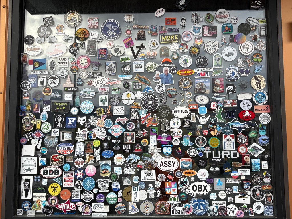 On 4th Avenue, the three windows of the Seward Brewing Company caught my eye because of the stickers plastered all over them: