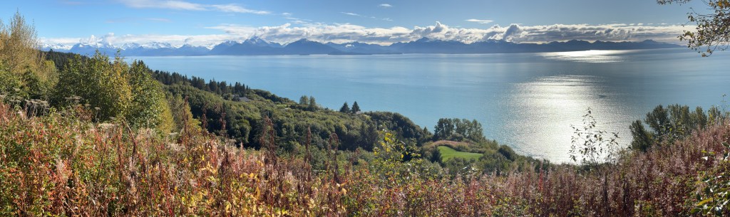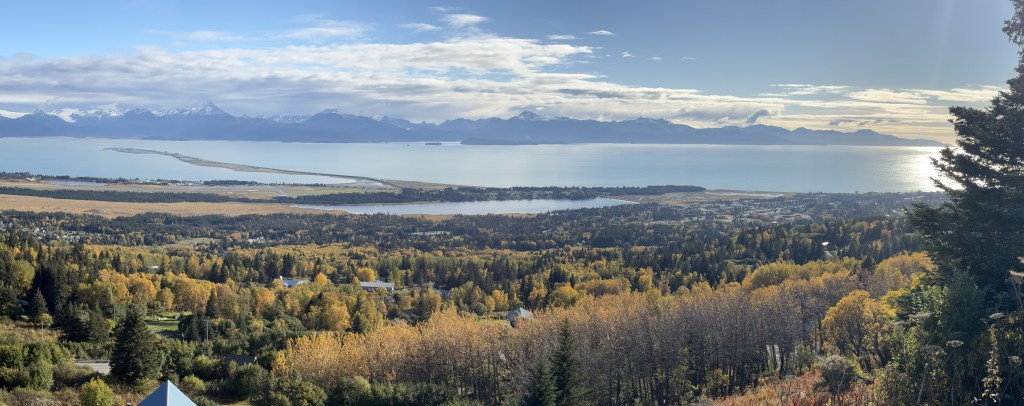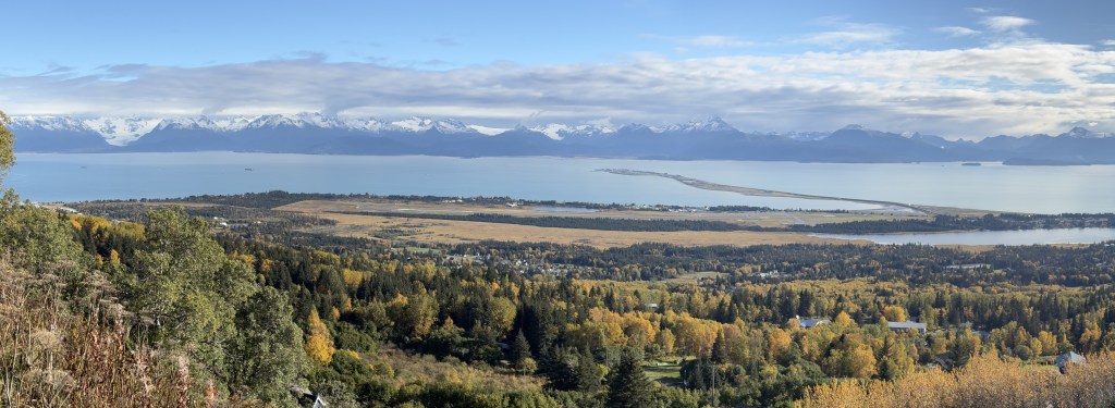 When I finally made it to Homer my first stop was at an overlook just off the highway. It was fairly high on a hill overlooking most of Kachemak Bay. The mountains you will see across the Bay are part of the Kenai Peninsula, on which Homer sits. The Bay wraps around further to the left