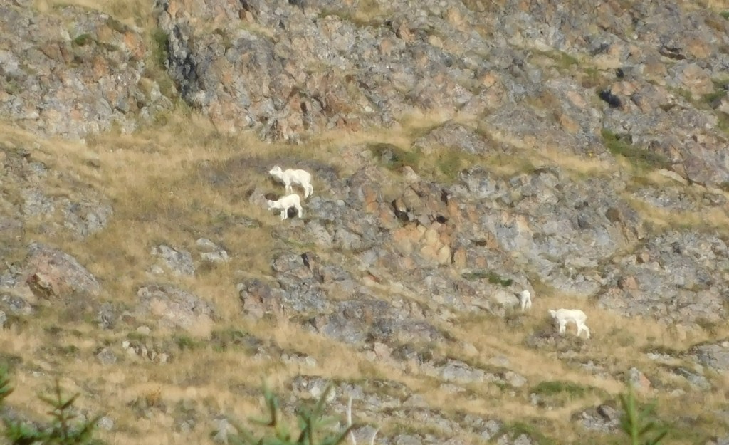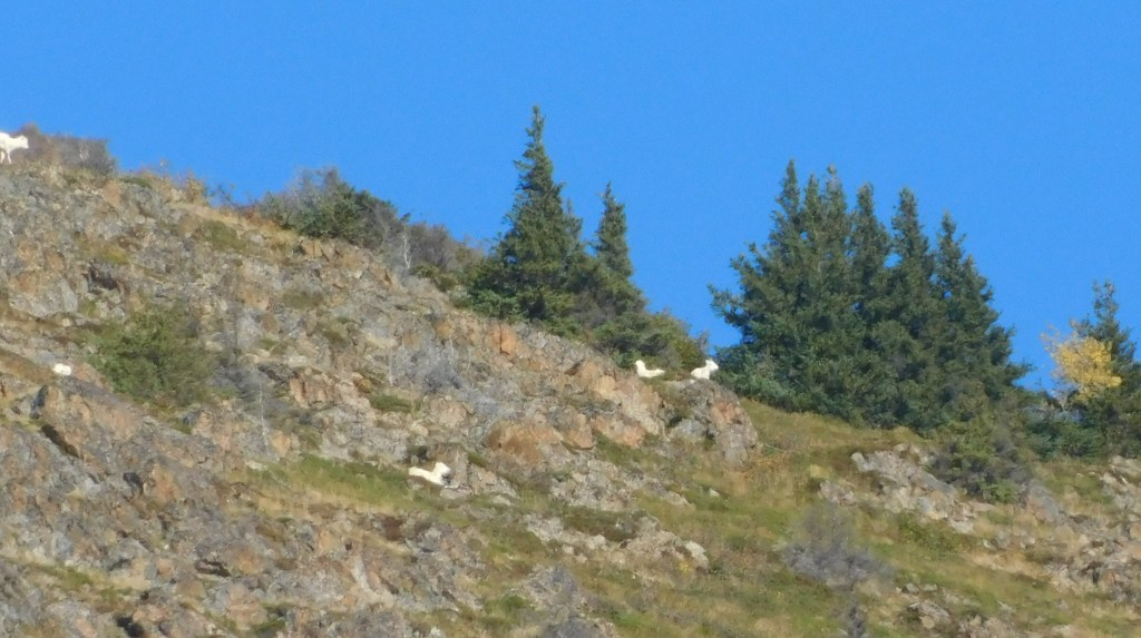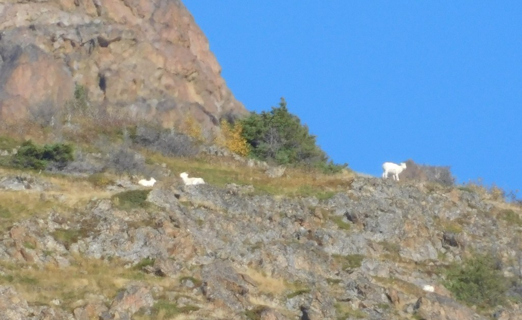 I was speaking with some of the other travelers who had stopped at the same pullout. One of them was using binoculars to look up a tall mountain across the road. She pointed out some white spots, and since I had my digital camera out I zoomed in and sure enough, she had spotted a bunch of mountain goats.