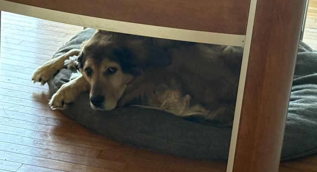 The one under the foosball table didn’t seem to be bothered but I learned later that she has trouble walking and tends to stay on her comfortable beanbag.